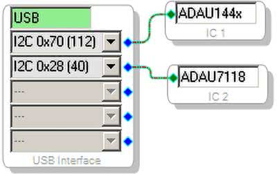 Aplikacja odczytuje dane z interfejsu szeregowego pracującego w trybie TDM8, w każdym dekodowanym kanale usuwana jest składowa stała i mierzony jest poziom sygnału. Następnie parami sygnały doprowadzone są do multipleksera. Do multipleksera doprowadzony jest też sygnał generatora testowego i miks sygnałów mikrofonów MIC1, 3, 5, 7 i MIC2, 4, 6, 8. Po regulacji poziomu, sygnał wysyłany jest na port wyjściowy I2S a stąd do pierwszego kanału karty wyjść audio w celu odsłuchu. ADAU7118 jest konfigurowany przez I2C z SigmaStudio. Schemat połączeń USBi pokazano na rysunku 8.