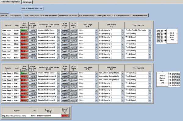 Odpowiadającą ustawieniom portu szeregowego ADAU7118 konfigurację interfejsu IO dla ADAU1442 pokazuje rysunek 11.