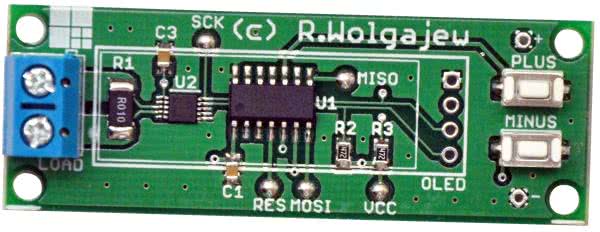 Dalej lutujemy pozostałe elementy półprzewodnikowe, potem rezystory i kondensatory jak i inne elementy bierne, a na końcu mikroprzełączniki PLUS i MINUS, buzzer piezoelektryczny oraz gniazdo podłączeniowe LOAD. Z uwagi na zagęszczenie wyprowadzeń układów scalonych przed pierwszym podłączeniem układu do zasilania należy jeszcze raz sprawdzić jakość wykonanych połączeń, aby nie dopuścić do ewentualnych zwarć. Wspomniana kontrola będzie znacznie łatwiejsza, jeśli zmontowaną płytkę przemyjemy alkoholem izopropylowym w celu wypłukania nadmiaru kalafonii lutowniczej. Na samym końcu montujemy wyświetlacz OLED, lutując jego wyprowadzenia w przeznaczone do tego celu pola lutownicze (należy sprawdzić polaryzację zasilania), gdyż połączenia elektryczne zapewniają mu jednocześnie wystarczająco stabilny montaż mechaniczny. Poprawnie zmontowany układ powinien działać tuż po włączeniu zasilania. Na fotografii 1 pokazano zmontowane urządzenie (od strony TOP) przed przylutowaniem wyświetlacza OLED.