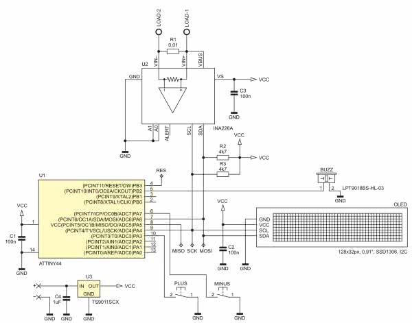 Schemat ideowy urządzenia pokazano na rysunku 2. Zaprojektowano bardzo prosty system mikroprocesorowy, którego „sercem” jest niewielki mikrokontroler firmy Microchip (dawniej Atmel) typu ATtiny44, odpowiedzialny za programową implementację interfejsu I2C, przy użyciu którego mikrokontroler realizuje obsługę układu INA226 oraz obsługę niewielkiego acz bardzo efektownego wyświetlacza OLED o rozdzielczości 128×32 piksele stanowiącego element graficznego interfejsu użytkownika. Wspomniany wcześniej, specjalizowany przetwornik ADC mierzy spadek napięcia na rezystorze szeregowym R1 (10 mΩ), dzięki czemu możliwe jest wyznaczenie prądu pobieranego przez badane urządzenie.