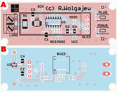 Schemat montażowy naszego urządzenia pokazano na rysunku 3. Zaprojektowano bardzo „zgrabną”, dwustronną, niewielką płytkę drukowaną, która swoim rozmiarem jest zbliżona do zastosowanego wyświetlacza OLED udostępniając dodatkowo niezbędne otwory montażowe. Warto również podkreślić, iż dla zminimalizowania rozmiaru obwodu drukowanego przewidziano tutaj montaż elementów po obu stronach laminatu. Aplikację urządzenia rozpoczynamy od przylutowania układu INA226. Najprostszym sposobem montażu elementów o tak dużym zagęszczeniu wyprowadzeń, niewymagającym jednocześnie posiadania specjalistycznego sprzętu, jest użycie zwykłej stacji lutowniczej, dobrej jakości cyny z odpowiednią ilością topnika oraz dość cienkiej plecionki rozlutowniczej, która umożliwi usunięcie nadmiaru cyny spomiędzy wyprowadzeń układu. Należy przy tym uważać by nie uszkodzić termicznie tegoż elementu.
