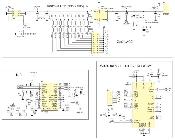 Wirtualny port szeregowy zbudowano w oparciu o układ firmy FTDI typu FT232RL (U1). Nie wymaga zastosowania rezonatora kwarcowego oraz posiada wszystkie sygnały portu szeregowego. W prezentowanym układzie potrzebne są tylko sygnały TX i RX podłączone do translatora napięć, ale pozostałe sygnały mogą być udostępnione na złączu Pu1 – jednak tylko w logice 3,3 V. Zgodnie z notą aplikacyjną układu zastosowano dwie diody LED do sygnalizacji nadawania i odbioru sygnałów. Jako huba USB użyto układu scalonego GL850G w jego podstawowej konfiguracji bez dodatkowej pamięci konfiguracyjnej.