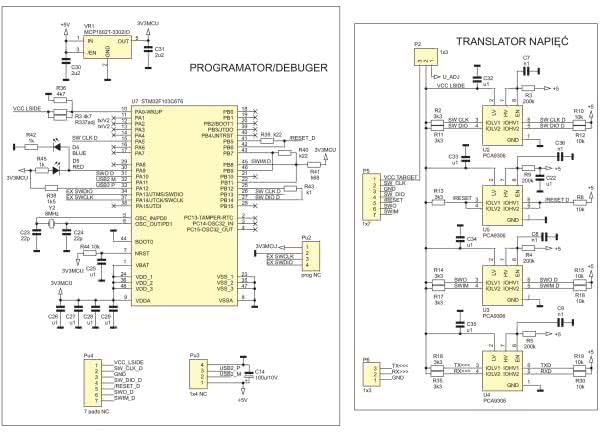 Sercem układu jest programator-debugger zbudowany w oparciu o procesor STM32F103 (U7). Zastosowano układ wylutowany z programatora kompatybilnego z ST-LINK/V2 (fotografia 1), jakie są stosunkowo tanie i dostępne w wielu sklepach internetowych.