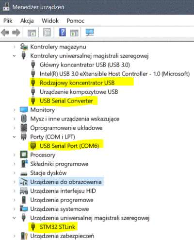Po podłączeniu układu do komputera w menedżerze urządzeń powinny pojawić się nowe wpisy zaznaczone na rysunku 5 (widok dla Windows 10), co będzie świadczyło o jego prawidłowym funkcjonowaniu.
