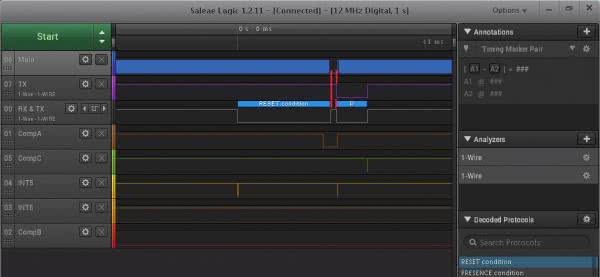 Problem „zawieszania” programu głównego na czas rozpoznawania sygnału reset, generowania presence i zera można rozwiązać timerami. Na rysunku 1 widać, że program główny (niebieski przebieg) pracuje, w czasie generowania sygnałów.