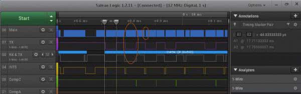 Widać wyraźną przerwę oczekiwania na koniec resetu, następnie opóźnienie 30 μs oraz start timera generującego sygnał presence. Podczas generowania bitu o wartości zero nie trzeba czekać na koniec sygnału, więc program główny jest zatrzymywany na krócej (rysunek 2). Widoczne są tylko krótkie przerwy w działaniu programu głównego (4,5 μs) po opadającym zboczu sygnału na magistrali.