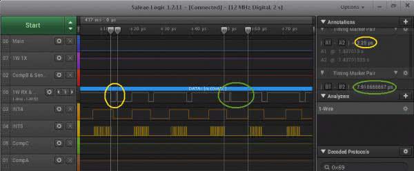 Jak się później okazało, po optymalizacji wszystko realizuje jedno przerwanie z wstawką asemblerową. Dlaczego więc opisałem sposób z dwoma przerwaniami? Ponieważ wymagania stawiane szybkości pracy mikrokontrolera są mniejsze i możliwa jest implementacja emulacji na niższych, częstotliwościach. Kolejne przyspieszenie uzyskuje się dzięki wykorzystaniu przerzutnika D. Na jego wejście podawany jest stan bitu do wystawienia w następnej transmisji zamiast ustawiania flagi FL_SEND_ZERO. Opadające zbocze sygnału strobującego odczyt przepisuje stan wejścia D przerzutnika na jego wyjście, które za pośrednictwem bramki z otwartym kolektorem wystawia bit na magistralę. Odstępstwem emulowanego układu od protokołu jest próbkowanie stanu bitu w trybie overdrive po 3 μs a nie 1 μs od opadającego zbocza sygnału ale biorąc pod uwagę, że czas stanu niskiego bitu 0 wynosi 7,5 μs nie stanowi to problemu. Jeśli jednak zajdzie konieczność zachowania pełnej zgodności należy wykorzystać sprzętowy układ odczytujący stan bitu składający się z multiwibratora 74HC123 i przerzutnika D. Na rysunku 4 pokazano analizę działania programu przy taktowaniu 16 MHz i bez przerzutnika D.
