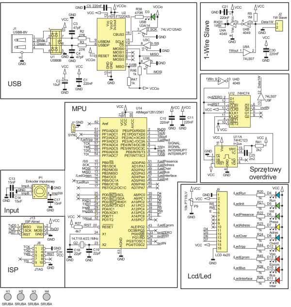 Zasilanie jest doprowadzone z portu USB. Konwerter USB-SPI akceptuje na wejściach napięcia do 3,3 V dlatego zastosowano konwerter poziomów na układzie 74LVC125. Komunikację z użytkownikiem zapewnia enkoder impulsowy i wyświetlacz LCD 4×20 znaków. Elementy te zamontowano od spodniej strony płytki dzięki czemu łatwiej urządzenie zamknąć w obudowie. Kontrast wyświetlacza można regulować potencjometrem. Elementy U11 i U12 wspomagają sprzętowo obsługę trybu overdrive. Diody led informują o stanie urządzenia (tabela 1).