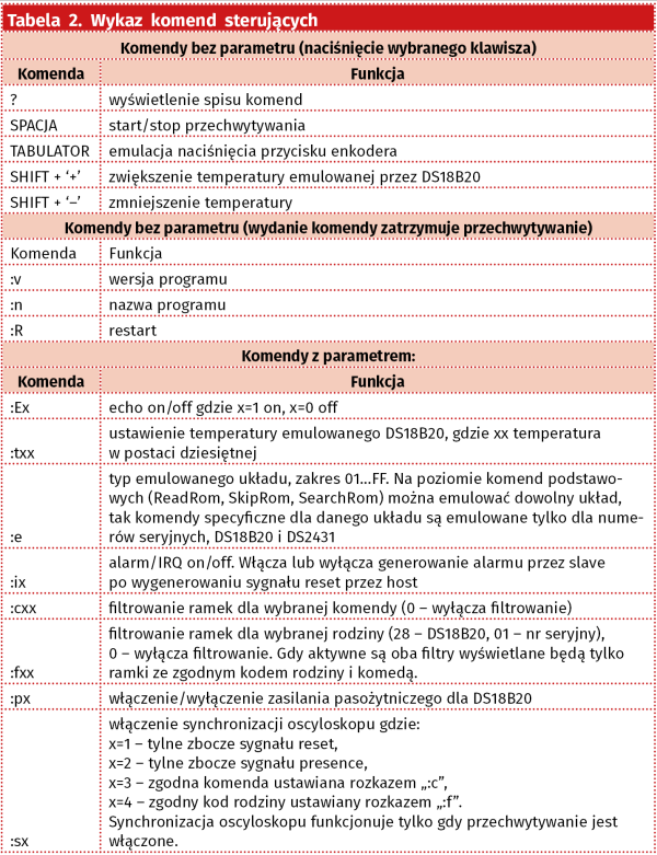 Sterowanie urządzeniem jest możliwe całkowicie poprzez program typu terminal, wykaz komend sterujących zawiera tabela 2.