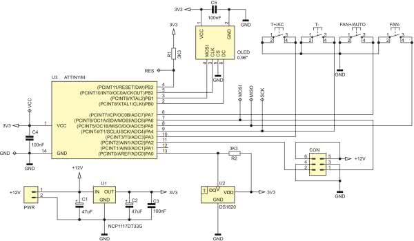 Zbudowano dość prosty system mikroprocesorowy, którego sercem jest mikrokontroler ATtiny84 produkcji firmy Microchip (dawniej Atmel) realizujący całą założoną funkcjonalność urządzenia. Mikrokontroler ten steruje pracą popularnego, graficznego wyświetlacza OLED o organizacji 128×64 piksele i przekątnej ekranu 0,96” stanowiącego element graficznego interfejsu użytkownika, wykorzystując w tym celu programową implementację szeregowego interfejsu SPI. Realizuje obsługę przycisków funkcyjnych, angażując w tym celu przerwanie licznika Timer0 wywoływane co 10 ms. Dzięki temu zaimplementowano skuteczny mechanizm eliminacji drgań styków i obsługę przycisków bez wstrzymywania pracy pętli głównej aplikacji (w tym obsługę długiego i krótkiego naciśnięcia przycisku). Mikrokontroler odpowiada także za programową realizację interfejsu 1-Wire niezbędnego do komunikacji ze scalonym termometrem DS1820 oraz steruje pracą dwóch stopni wyjściowych (wyprowadzenia PA2 i PA6 mikrokontrolera), których elementy wykonawcze znajdują się na module wykonawczym urządzenia.