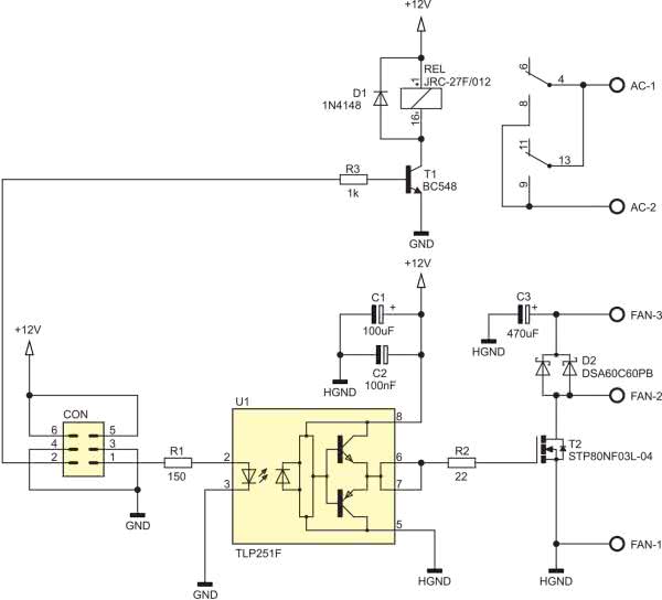 Zastosowanie tego, specjalizowanego i optoizolowanego sterownika wynikało, po pierwsze, z potrzeby izolacji napięcia zasilania sterownika Climatic II od obwodu wyjściowego mocy wentylatora FAN, a po drugie i najważniejsze, z konieczności zapewnienia odpowiedniego przebiegu sterującego bramką tranzystora wyjściowego T2 w celu ograniczenia mocy rozpraszanej na tym elemencie oraz ograniczenia poziomu emitowanych zakłóceń. Dodatkowo, równolegle do zacisków sterowanego silnika DC (wentylatora), dołączono szybką diodę Schottky'ego (D2) odpowiedzialną za redukcję przepięć indukowanych podczas sterowania mocą elementu o charakterze indukcyjnym za pomocą przebiegu PWM.