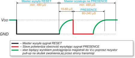 Na rysunku 3 pokazano sekwencję inicjalizacji magistrali 1-Wire, która umożliwia układowi Master wykrycie podłączonych do magistrali układów Slave. Rozpoczyna się poprzez wysłanie przez układ Master sygnału Reset (ściągnięcie magistrali do masy przez 480…960 μs) i po odczekaniu 15…60 μs, odpowiedzią układów Slave poprzez wysłanie sygnału Presence (ściągnięcie magistrali do masy przez 60…240 μs).