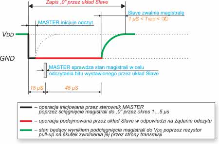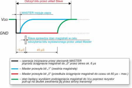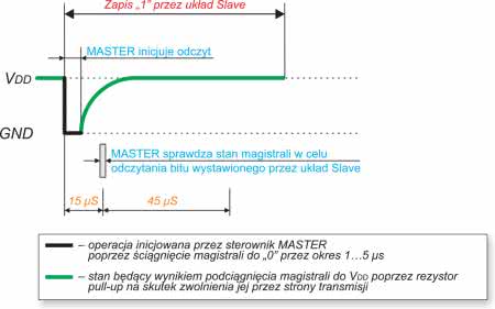 Na rysunkach 4 i 5 pokazano sekwencje sygnałów sterujących obrazujące operację zapisu danych (logicznego „0” i „1”) przez układ Slave na magistralę 1-Wire a będącą wynikiem żądania odczytu ze strony układu Master (ściągnięcie magistrali do masy przez 1…5 μs).