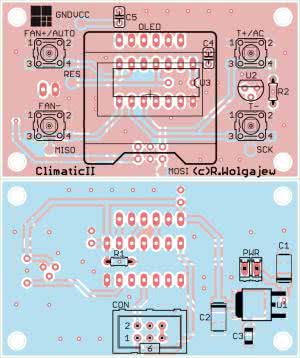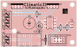 Płytkę modułu wykonawczego, urządzenia Climatic II, pokazano na rysunku 8. Montaż rozpoczynamy od przylutowania wszystkich półprzewodników. Następnie lutujemy elementy bierne a na samym końcu gniazda AC, FAN oraz CON. Ścieżki przewodzące duże prądy pokrywamy dodatkową warstwą cyny (w tym celu nie zostały one pokryte maską lutowniczą). W przypadku sterowania pracą wentylatora większej mocy konieczne może być wyposażenie elementów D2 oraz T2 w radiator rozpraszający ciepło mocy strat. W układzie prototypowym sterowano pracą wentylatora nawiewu pozyskanego z auta Fiat Punto II, który to w trakcie pracy pobierał prąd rzędu 8 A a mimo to nie było potrzeby implementacji radiatora mocy. Na rysunku 9 pokazano przykładowy sposób przygotowania radiatora.