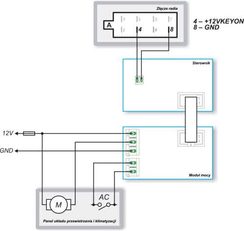 - Panel sterowania nawiewem i klimatyzacją – umożliwia automatyczne sterowanie układem klimatyzacji manualnej (złącze AC) oraz wentylatorem nawiewu (złącze FAN) – ważny jest przekrój przewodów z uwagi na duże prądy, min. 1,5 mm2.
