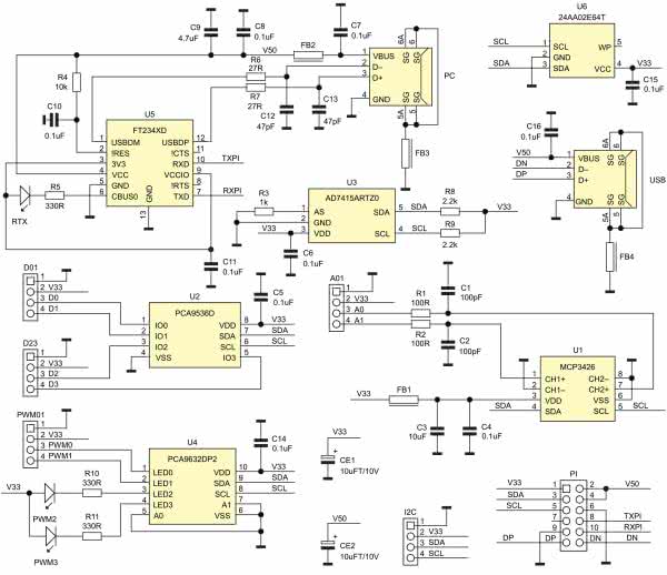 Schemat ideowy modułu został pokazany na rysunku 1. Na płytce znalazło się miejsce na układy z interfejsem I2C, obsługujące typowe GPIO. Układ U1 typu MCP3426 pełni funkcję przetwornika AD z dwoma wejściami, o zakresie mierzonego napięcia 0…2,048 V i maksymalnej rozdzielczości 16 bitów. Sygnał analogowy ze złącza A01, po filtracji realizowanej za pomocą elementów R1, R2, C1, C2, doprowadzony jest bezpośrednio do układu U1, typu MCP3426. Ma on ustalony adres I2C o wartości 0x68 (dla MCP3426A0). Zwracam uwagę na konflikt adresów z często używanym układem RTC typu DS1338. Jeżeli planujemy zastosować na magistrali I2C także zewnętrzny RTC, należy wykorzystać w miejsce U1 układ o zaprogramowanym fabrycznie adresie, różnym od 0x68, np. MCP3426A1 do MCP3246A7.