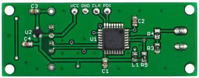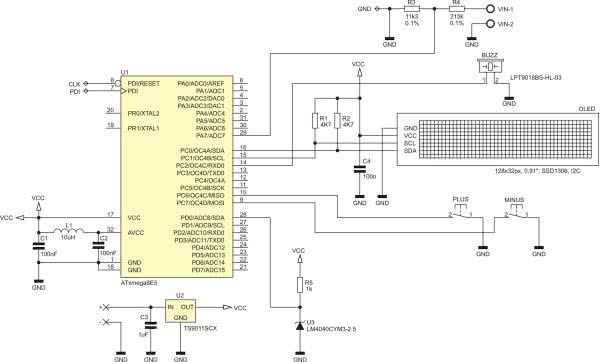 Uwagę skierowałem na najnowsze konstrukcje mikrokontrolerów AVR z rodziny ATXmega, serii E. W przypadku tych układów mamy do dyspozycji wbudowany, 12-bitowy przetwornik ADC o zdecydowanie lepszych parametrach elektrycznych, jak i dość dokładne (w porównaniu z poprzednim) źródło napięcia odniesienia, z którego w końcowej aplikacji jednak nie skorzystałem. Zastosowałem tutaj zewnętrzną, bardzo dokładną referencję pod postacią układu LM4040CYM3-2.5 (U3), który nie dość, że bardzo tani, to dodatkowo odznacza się świetnymi parametrami elektrycznymi, co najmniej o rząd wielkości lepszymi, niż źródła wbudowane w strukturę mikrokontrolera ATXmega.