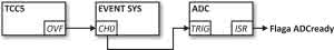 Podstawowym podsystemem mikrokontrolera ATXmega8E5 inicjującym pomiar przetwornika ADC jest układ czasowo-licznikowy TCC5, który jest taktowany wysokostabilnym przebiegiem zegarowym o częstotliwości 250 kHz. Sygnał jest uzyskiwany dzięki podzieleniu zegara 2 MHz taktującego rdzeń mikrokontrolera przez preskaler o podziale 8. Zdarzenie przepełnienia licznika (OVF) jest generoweane co 25000 taktów zegara (PER=24999), czyli 10 razy na sekundę, i jest połączone z kanałem CH0 systemu zdarzeń (EVENT SYSTEM), dla którego stanowi źródło zdarzeń. Kanał CH0 systemu zdarzeń jest z kolei wyzwalaczem (TRIG) dla wbudowanego w strukturę mikrokontrolera przetwornika ADC, dzięki czemu możliwe jest próbkowanie wejściowego sygnału VIN w równych odstępach czasu (10 Hz). Dalej, przerwanie od zakończenia konwersji przetwornika ADC (ADCA_CH0_vect) odpowiedzialne jest wyłącznie za ustawienie flagi programowej ADCready dla programu obsługi aplikacji.