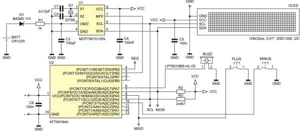 Układ MCP-79410 idealnie wpisuje się w wymagania naszej aplikacji, w związku z tym przejdźmy od razu do schematu aplikacyjnego urządzenia μClock, który pokazano na rysunku 1. Zaprojektowano bardzo prosty system mikroprocesorowy, którego sercem jest niewielki mikrokontroler firmy Microchip o oznaczeniu ATtiny84A. Realizuje on kilka kluczowych zadań w ramach programu obsługi aplikacji, a mianowicie: steruje pracą wbudowanego wyświetlacza OLED o organizacji 128×32 piksele stanowiącego element interfejsu użytkownika, angażując w tym celu interfejs I2C, zarządza współpracą ze wspomnianym wcześniej scalonym układem RTC typu MCP-79410 angażując, jak poprzednio, ten sam sprzęg I2C oraz obsługuje dwa przyciski funkcyjne PLUS i MINUS oraz buzzer piezoelektryczny BUZZ, będące elementami interfejsu użytkownika.