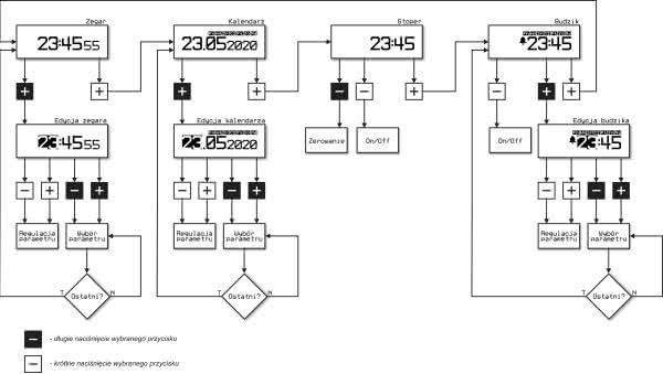 Wszystkie te funkcjonalności obsługuje się w bardzo intuicyjny sposób za pomocą wyłącznie dwóch klawiszy funkcyjnych. Klawisze przyjmują różne funkcjonalności zależne od trybu pracy, w jakim urządzenie się znajduje. Sposób obsługi wraz z zaznaczeniem funkcji każdego z klawiszy (PLUS i MINUS) pokazano na rysunku 6.