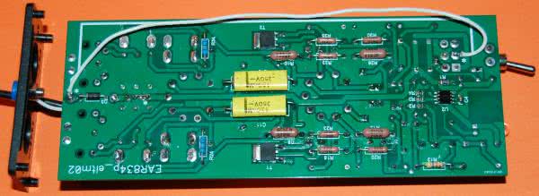 Kondensatory C16 i C23 o pojemności 330 pF mogą być zastąpione pomierzoną parą 220 pF i 100 pF – w ten sposób łatwiej uzyskać wymaganą pojemność równą dokładnie 330 pF. W obwodzie sprzężenia zwrotnego kształtującego charakterystykę RIAA zastosowano kondensatory silver-mica. W pozostałych miejscach zastosowano kondensatory MKSE (150 nF) i MKC (2,2 µF). Zmontowana płytka została pokazana na fotografii 3 i fotografii 4.