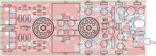 Kompletny schemat przedwzmacniacza został pokazany na rysunku 5, natomiast rysunek 6 pokazuje schemat płytki PCB. Elementy układu rozmieszczono na dwustronnej płytce drukowanej Miejsca na spodzie płytki zaznaczone gwiazdkami wymagają oddzielnego połączenia przewodem.