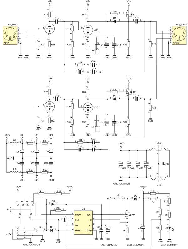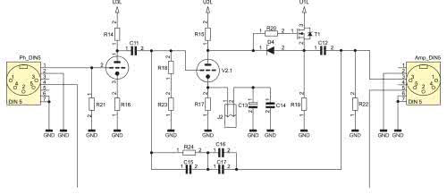 Popularny i chwalony w sieci jest układ przedwzmacniacza EAR834p. Jest to rozwiązanie, którym inspirował się autor, ale zastosował kilka własnych modyfikacji. Schemat układu pokazano na rysunku 1. Na schemacie widoczny jeden kanał wzmacniacza, którego wejścia i wyjścia zostały wyprowadzone na gniazda DIN5. Dwa stopnie lampowe pracują w układzie wspólnej katody. Pierwszy stopień wzmacniacza, który zawiera połówkę lampy V1 (6N2P-EW), wzmacnia sygnał wejściowy i jednocześnie zapewnia właściwe obciążenie wkładki gramofonowej.
