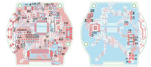 Największą trudność mogą sprawić komponenty w obudowach LGA – czujnik BME280 oraz magnetmetr QMC5883L. Przylutowanie tych komponentów wymaga użycia kolby hot-air. Odpowiednie ustawienie mikrokontrolera i kontrolera ładowania na PCB, można rozpoznać po przedłużonej linii pierwszego wyprowadzenia (U4 jest odwrócony). W przypadku magnetometru U5 pierwsza nóżka znajduje się w prawym górnym rogu, zaś BME280 (U1) montujemy otworem z lewej strony.