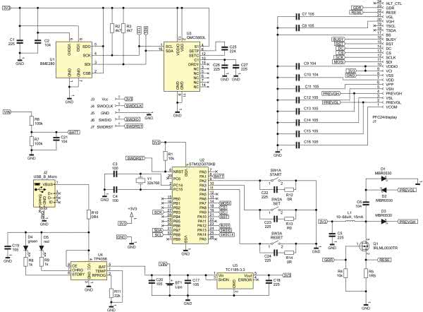 Schemat ideowy został pokazany na rysunku 1. Możemy na nim wyróżnić kilka funkcjonalnych bloków: czujniki, interfejs wyświetlacza z przetwornicą napięcia, mikrokontroler z klawiaturą sterującą oraz blok zasilania z obwodem ładowania akumulatora.