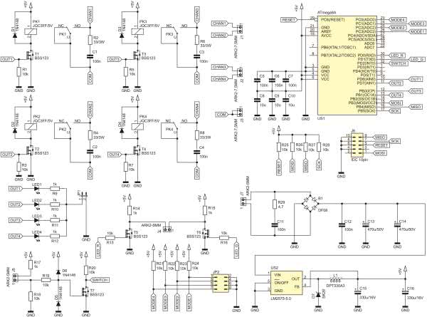 Schemat układu znajduje się na rysunku 1. Jego zadaniem jest załączanie czterech odbiorników, do czego służą cztery przekaźniki. Ich cewki są przystosowane do zasilania napięciem stałym o wartości 5 V, takim reszta elektroniki. Między styki normalnie otwarte, został włączony układ RC, pełniący rolę gasika. Ogranicza on emisję zakłóceń elektromagnetycznych przez iskrzące (w momencie przełączania) styki, co znacząco zmniejsza prawdopodobieństwo zawieszenia się układu.