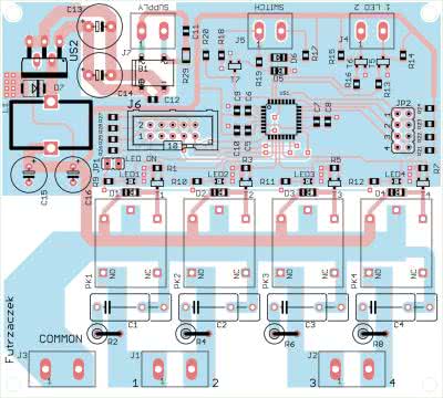 Wyprowadzenia styków środkowych przekaźników są przyłączone do jednego złącza J3, a wyjścia na poszczególne odbiorniki – do pojedynczych zacisków w złączach śrubowych J1 i J2.