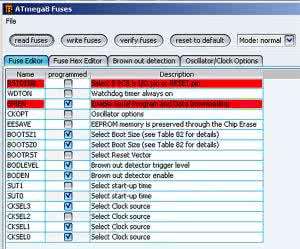 Jeżeli montaż przebiegł bez problemów, można przejść do zaprogramowania mikrokontrolera. W tym celu należy podłączyć napięcie, najlepiej stałe, o wartości z zakresu 12…40 V, do zacisków złącza J7. Wymagane dla układu wartości bitów zabezpieczających wynoszą: High Fuse: 0xD9, Low Fuse: 0x24. Szczegóły znajdują się na rysunku 3, zawierającym widok z okna konfiguracji bitów zabezpieczających w programie AVR Burn-O-Mat. Takie ustawienie spowoduje uruchomienie wewnętrznego generatora RC o częstotliwości 8 MHz i BOD (Brown-Out Detector), na wartość ok. 4 V. Na koniec wystarczy zaprogramować pamięć Flash dostarczonym wsadem i możemy cieszyć się w pełni działającym układem.