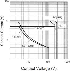Ponieważ używane są styki NO (normalnie otwarte), trzeba patrzeć na krzywe opisane indeksem „1H”. Dla napięcia stałego przewodzony prąd może być znacząco niższy, niż dla napięcia przemiennego.