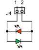 Dwukolorowa dioda LED, zawierająca dwie połączone, antyrównolegle struktury świecące. Powinna zostać podłączona według schematu z rysunku 6 tak, aby katoda struktury świecącej w kolorze czerwonym, była podłączona do zacisku opisanego na płytce jako „1” (chodzi o opis „1 LED 2”, znajdujący się przed złączem). Mogą to również być dwie oddzielne diody lub świecące w innych kolorach. Zastosowanie tylko dwóch przewodów do jej podłączenia, bardzo upraszcza montaż, gdyż przewód dwużyłowy łatwiej jest dobrać i zamontować, niż trójżyłowy.