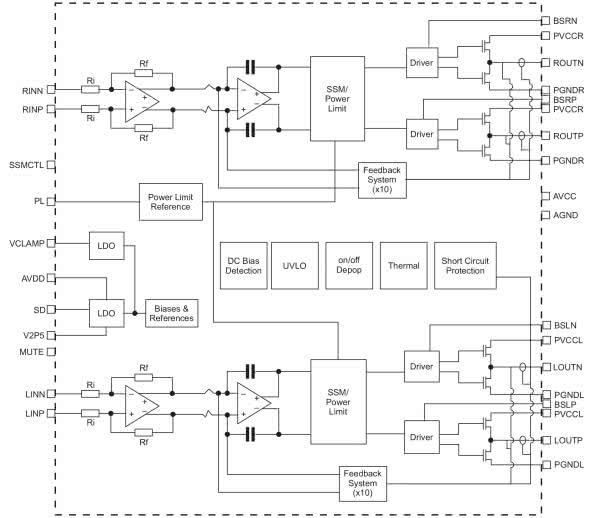Zastosowany w module układ PAM8106 firmy Diodes Inc. integruje w sobie dwukanałową mostkową końcówkę mocy 2×10 W/8 Ω (12 V) pracującą w klasie D. Umożliwia pracę z modulacją rozproszoną, zmniejszająca generowane zaburzenia EMI, posiada układ zabezpieczeń oraz konfigurowany limiter mocy przydatny przy pracy bateryjnej. Układ osiąga sprawność ponad 92%, co umożliwia w większości przypadków pracę bez zewnętrznego radiatora. Zamykany jest w obudowie QFN5050-32 z padem termicznym. Sporą zaletą PAM8106 jest niska cena, która nawet przy jednostkowych zamówieniach oscyluje poniżej 1,5 $. Strukturę wewnętrzną układu pokazano na rysunku 1.