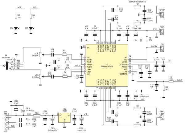 Zasilanie układu dostarczone jest poprzez złącze PWR i powinno mieścić się w zakresie 9...14,4 V, co odpowiada napięciu akumulatora żelowego lub pakietu 3×Li-Po w zastosowaniach przenośnych. Dzielnik R7, R8 ustala próg zadziałania limitera na ok. 8 W. Zwarcie zwory SD, wprowadza układ w tryb obniżonego poboru mocy. Stabilizator U2 7805 zapewnia zasilanie modułu Bluetooth. Po wymianie U2 na wersję LDO, możliwe jest obniżenie dolnej granicy napięcia zasilania do ok. 6 V, gdyż sam układ PAM8106 pracuje poprawnie do 4,5 V.
