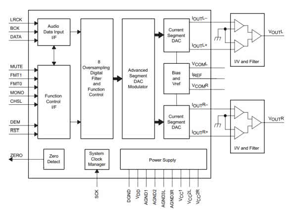Sześć starszych bitów słowa danych jest konwertowanych przez moduł ICOB, a 18 młodszych bitów – przez modulator Sigma-Delta. Różnicowe wyjście prądowe z układu, pozwala na zastosowanie zewnętrznego konwertera prąd/napięcie I/V o lepszych parametrach niż ten, który można zaimplementować w strukturze układu scalonego. Przetworniki wyższych klas najczęściej korzystają z takiego rozwiązania. PCM1794A nie ma interfejsu pozwalającego na zapisanie ustawień i ewentualną cyfrową regulację poziomu sygnału przez mikrokontroler – host. Wszystkie możliwe konfiguracje są wykonywane przez wymuszanie stanów logicznych na wejściach konfiguracyjnych układu.