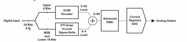 Schemat blokowy przetwornika pokazano na rysunku 1. Dane z interfejsu szeregowego są poddawane standardowemu 8-krotnemu nadpróbkowaniu w cyfrowym filtrze dolnoprzepustowym. Nadpróbkowanie pozwala uprościć analogowy dolnoprzepustowy filtr rekonstruujący, bo może mieć szersze pasmo przepustowe i łagodną charakterystykę opadania. Konwersja cyfra/prąd jest wykonywana w zaawansowanym modulatorze, zbudowanym z dwóch bloków: dekodera ICOB i 5-poziomowego modulatora Sigma-Delta (rysunek 2).
