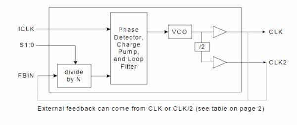 Schemat blokowy układu pokazuje rysunek 3. Do prawidłowego działania potrzebne jest zewnętrzne połączenie pomiędzy sygnałem wyjściowym i wejściem sprzężenia zwrotnego FBIN. Jako sygnał sprzężenia można użyć sygnału wyjściowego CLK lub sygnału wyjściowego, o częstotliwości podzielonej przez dwa CLK2. Jeżeli zakres powielanych częstotliwości na to pozwala, to należy wybrać sygnał podzielony przez dwa (CLK2), ponieważ sygnał wyjściowy CLK ma w tym przypadku lepsze parametry, na przykład dwa razy mniejszy jitter. Dlatego w naszym układzie sygnałem sprzężenia zwrotnego jest sygnał z wyjścia CLK2.