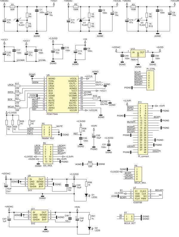 Sygnały magistrali I2S z Raspberry Pi są podłączane przez 40-pinowe złącze P11. Wyprowadzenia tego złącza są powieleniem wyprowadzeń złącza I/O komputerka i można je łączyć 1:1. Dalej Sygnały I2S trafiają na złącze P6, w założeniu przeznaczone dla układu izolatora galwanicznego. W części konstrukcji DAC stosowane są izolatory galwaniczne po to, by zakłócenia generowane w komputerku nie przenosiły się poprzez masę do układu przetwornika. To trochę kontrowersyjne rozwiązanie, bo bez dokładnych pomiarów trudno rozstrzygnąć, czy układ izolacji nie wprowadza zniekształceń, na przykład różnych przesunięć fazowych, pomiędzy sygnałami o różnych częstotliwościach na liniach I2S. Może się okazać, że zysk z tłumienia zakłóceń jest całkowicie niwelowany przez wprowadzane zniekształcenia sygnału cyfrowego albo nawet, że z izolatorem jest gorzej niż przy jego braku. W prototypowym rozwiązaniu nie ma izolatora – linie I2S są połączone bezpośrednio do układu przetwornika, przez zworki na złączu P6. Szeregowe rezystory 27 V: R17, R18, R21 i R23 mają za zadanie dopasować wyjścia I2S do wejść PCM1794A i zminimalizować zmiany kształtu sygnałów cyfrowych.