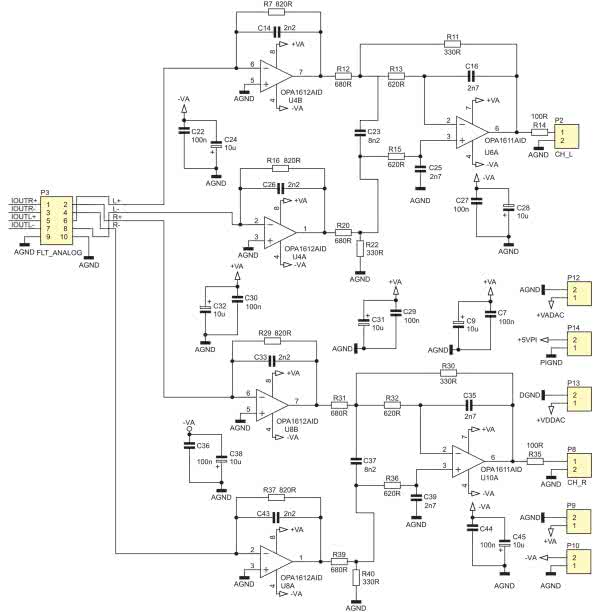 - Układ przetwornika zostanie wyposażony w układy konwertera prąd/napięcie i filtra analogowego (rekonstrukcyjnego) zbudowanego na wzmacniaczach operacyjnych. Różnicowe prądowe sygnały z wyjścia przetwornika będzie można alternatywnie dołączać do innych zewnętrznych układów analogowych, przez zworki na płytce drukowanej;