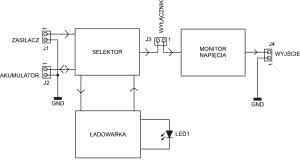 Selektorem źródeł jest zwykły przekaźnik elektromagnetyczny. Jego cewka jest zasilana z zasilacza. Kiedy na zaciskach złącza J1 pojawia się napięcie, styki ulegają przełączeniu: do wyjścia dołączany jest zasilacz, a akumulator zostaje podłączony do ładowarki. Kiedy napięcie z zasilacza zniknie, do wyjścia – przez styki NC – podłączany jest akumulator. Dzięki temu, pobór prądu z akumulatora jest zerowy, zaś kilkanaście miliamperów więcej dla zasilacza sieciowego nie stanowi żadnej różnicy.