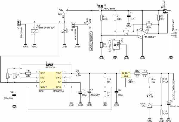 W roli ładowarki akumulatora kwasowego wystąpił bardzo prosty tandem: przetwornica podwyższająca napięcie + układ stabilizatora liniowego, który je obniża. Takie rozwiązanie jest bardzo proste i stosunkowo tanie, chociaż nie cechuje się wysoką sprawnością. Jeżeli jednak prąd ładowania nie jest zbyt wysoki, można się z tym pogodzić, uzyskując w zamian bardzo prosty i pewny w działaniu układ.