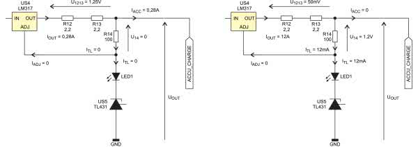 W skrajnej sytuacji, układ TL431 pobierze prąd o natężeniu ok. 12 mA. Stanie się tak, gdy niemal całe napięcie 1,25 V będzie odłożone na R14, zaś przez R12 i R13 będzie płynął prąd o niemal takim samym natężeniu. Akumulator nie będzie wtedy ładowany, ponieważ cały prąd z wyjścia LM317 zostanie pobrany przez TL431.Zwiększając sztucznie napięcie na R14, doprowadzamy do ograniczenia prądu wyjściowego. Następuje wtedy przejście do drugiego etapu ładowania – utrzymywanie stałego napięcia.
