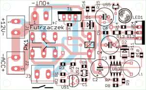 Układ został zmontowany na niewielkiej, dwustronnej płytce drukowanej o wymiarach 65×40 mm. Wzór ścieżek oraz schemat montażowy został pokazany na rysunku 4. W odległości 3 mm od krawędzi płytki znalazły się otwory montażowe o średnicy 3,2 mm.