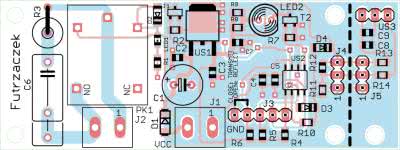 Układ został zmontowany na dwustronnej płytce drukowanej o wymiarach 80×30 mm, przy czym część o wymiarach 10×30 mm jest przeznaczona na czujnik i może zostać odcięta wzdłuż przerywanej linii. Wzór ścieżek tej płytki oraz jej schemat montażowy został pokazany na rysunku 4. W odległości 3 mm od krawędzi głównej części płytki znalazły się otwory montażowe o średnicy 3,2 mm, a w części z czujnikiem jeszcze jeden, gdyby zaszła potrzeba jego przykręcenia.