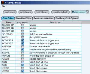 Spowoduje to wyłączenie preskalera zegara. Ponadto, ustawi BOD (Brown-Out Detector) na napięcie 4,3 V, co zmniejsza ryzyko zawieszenia się układu w trakcie włączania zasilania, zwłaszcza narastającego powoli. Szczegóły konfiguracji zostały pokazane na rysunku 5, który zawiera widok okna konfiguracji bitów zabezpieczających programu AVR-Burn-O-Mat. Oprócz tego, trzeba też zaprogramować pamięć programu dostarczonym wsadem.
