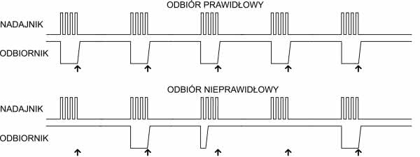 Sprawdzenie otoczenia odbywa się poprzez wysłanie pięciu impulsów IR o długości 400 µs każdy, z odstępami po 2 ms. Ten cykl jest powtarzany co 5 ms. Schematycznie pokazuje to rysunek 6. Strzałki to momenty sprawdzenia stanu wyjścia odbiornika. Zarejestrowanie świecenia diody przez odbiornik to stan niski.