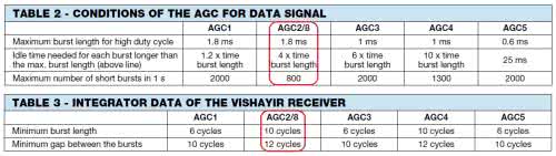 Odstęp czasowy między grupami impulsów jest wymagany do poprawnego działania odbiornika. Powodem jest automatyczna regulacja wzmocnienia, która ma na celu eliminację zakłóceń pochodzących np. od lamp fluorescencyjnych. Zarówno długość ciągu impulsów nadawanych przez diodę, jak i odstępy między nimi, muszą być odpowiednio dobrane. Z noty katalogowej użytego układu odbiorczego (TSOP4836) dowiadujemy się, że jest typu AGC2. Szczegóły dotyczące tego oznaczenia objaśnia dokument „Circuit Description of the IR Receiver Modules”, opublikowany przez firmę Vishay. Jego fragmenty zostały pokazane na rysunku 7.