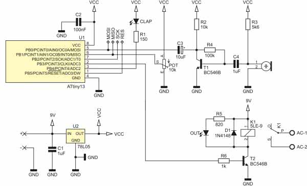 Schemat urządzenia nazwanego Clap2 został pokazany na rysunku 1. Jest to bardzo prosty system mikroprocesorowy, którego pracą steruje miniaturowy mikrokontroler ATtiny13 firmy Microchip (dawniej Atmel). Taktowany jest wewnętrznym, wysokostabilnym generatorem RC o częstotliwości 128 kHz.